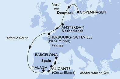 Маршрут круиза: Копенгаген / Дания – море – Амстердам / Нидерланды – море – Шербур / Франция –2 дня море – Малага/ Испания – Аликанте / Испания - Барселона / Испания